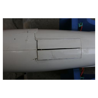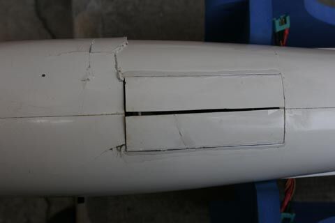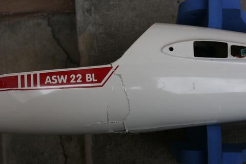 Das Modell erlitt einen mehrfachen Rumpf-Bruch sowie massive Schäden an beiden Flügeln. (geöffnete Halbschalen, zerstörte Bremsklappen usw.