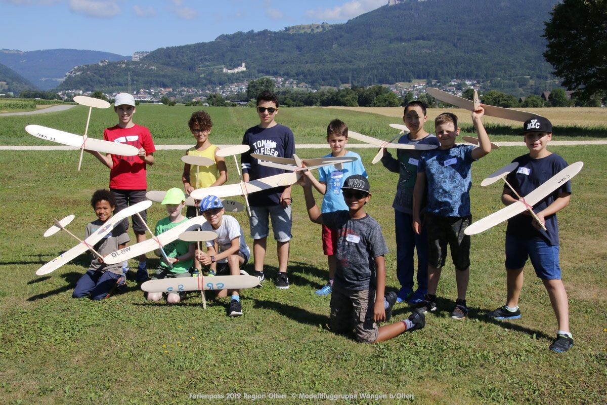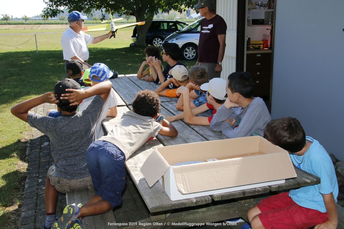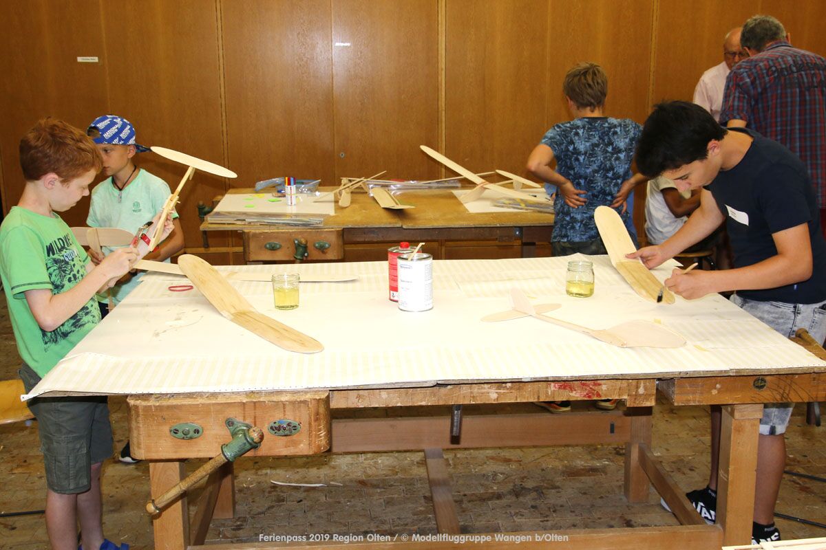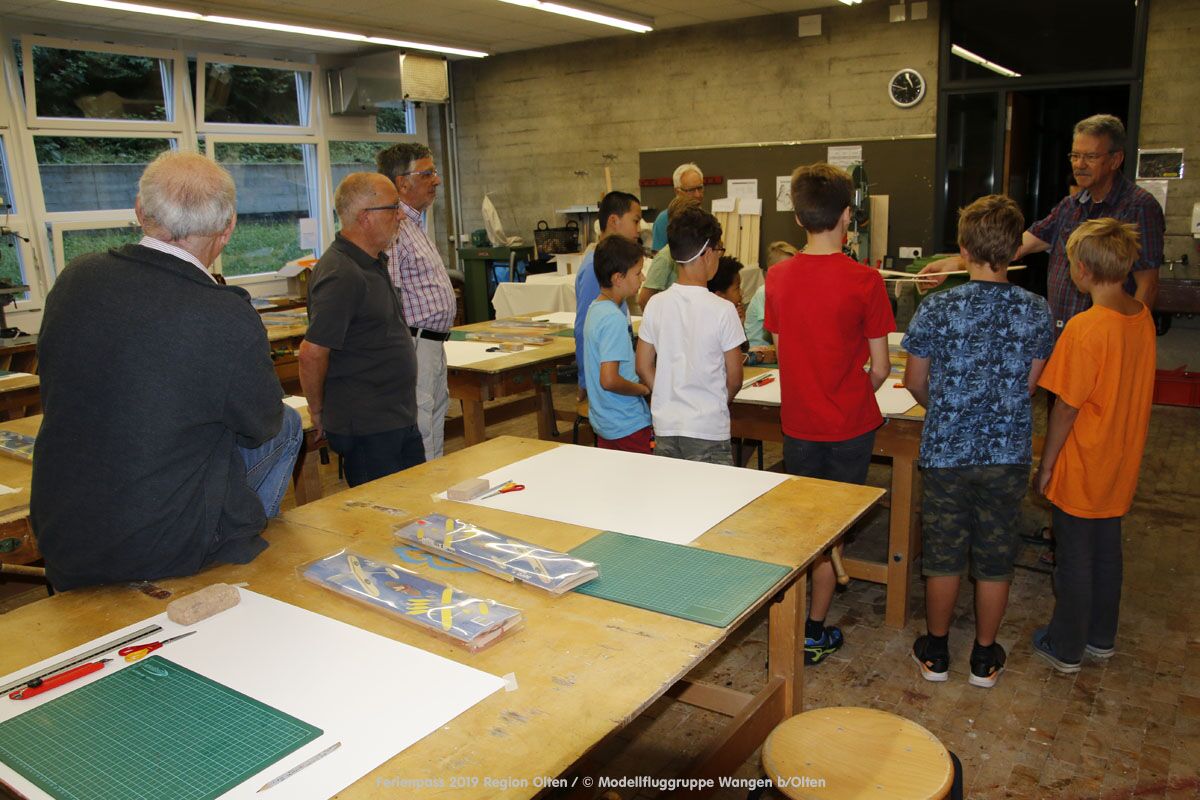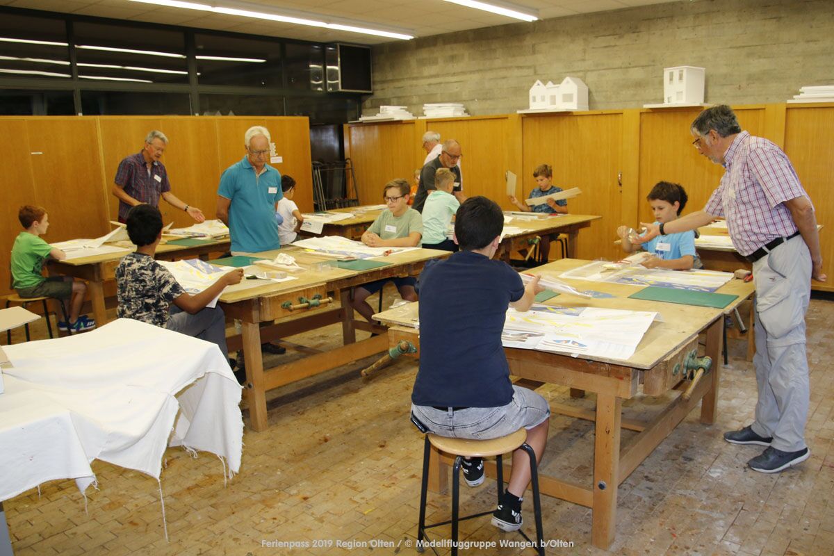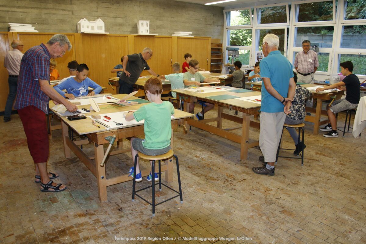 Anlässlich des Ferienpasses der Region Olten Ende Juli 2019, konnten wir 12 Schüler beim Kurs "Ein Flugzeug bauen und fliegen" im Hinterbüel Schulhaus in Wangen bei Olten begrüssen!