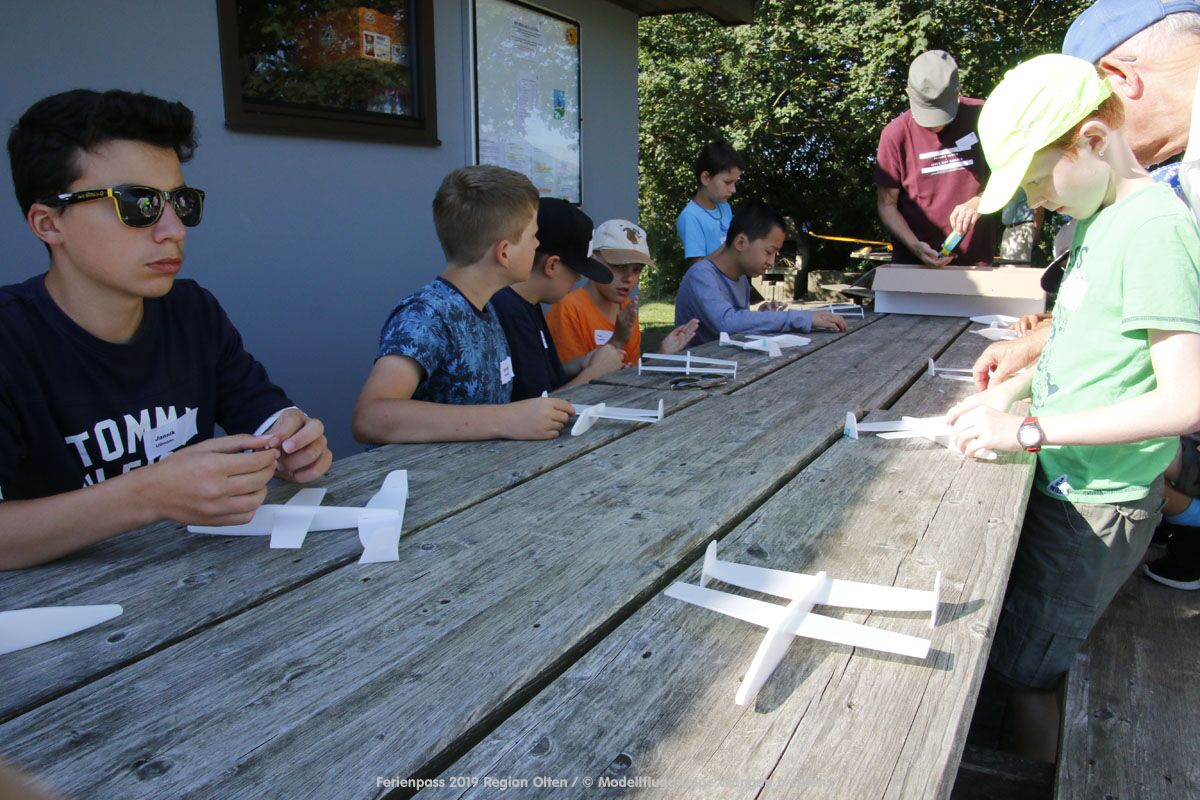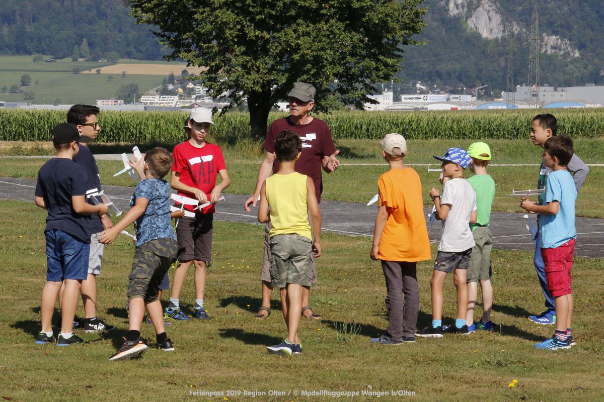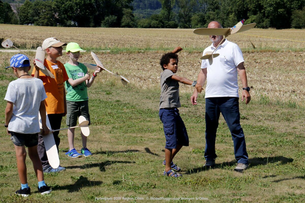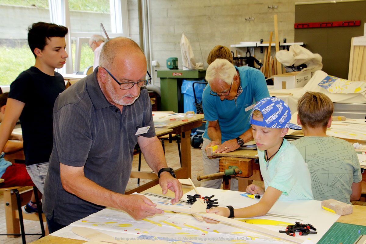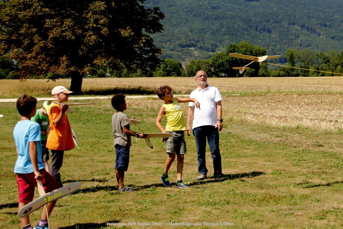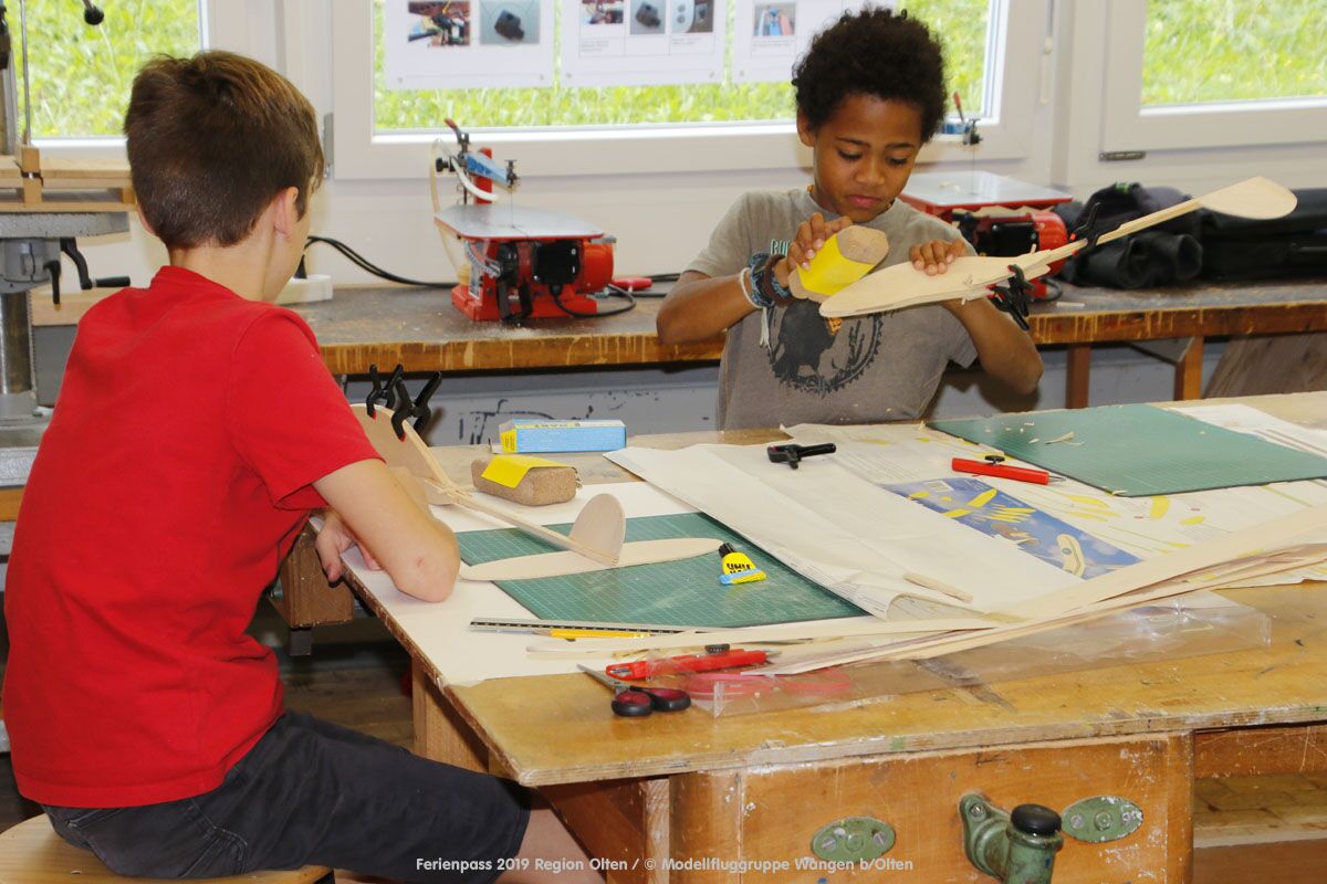 Anlässlich des Ferienpasses der Region Olten Ende Juli 2019, konnten wir 12 Schüler beim Kurs "Ein Flugzeug bauen und fliegen" im Hinterbüel Schulhaus in Wangen bei Olten begrüssen!