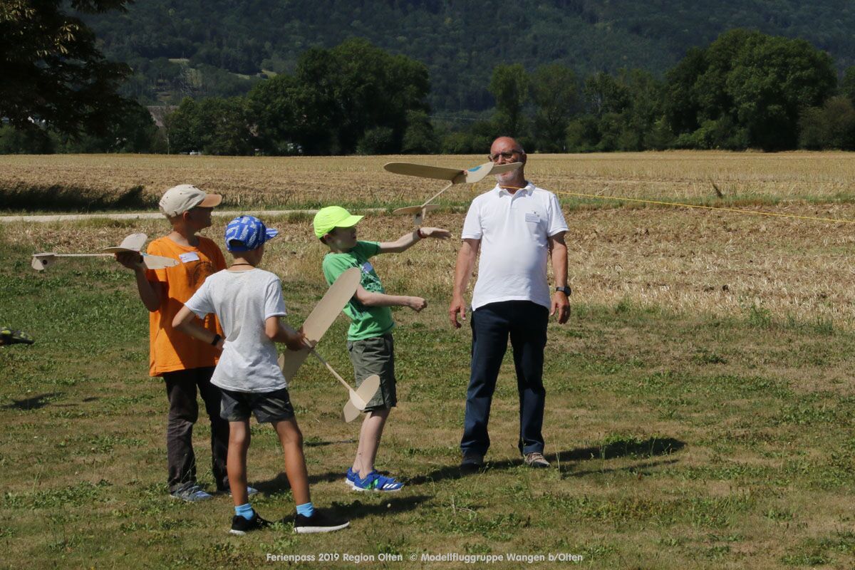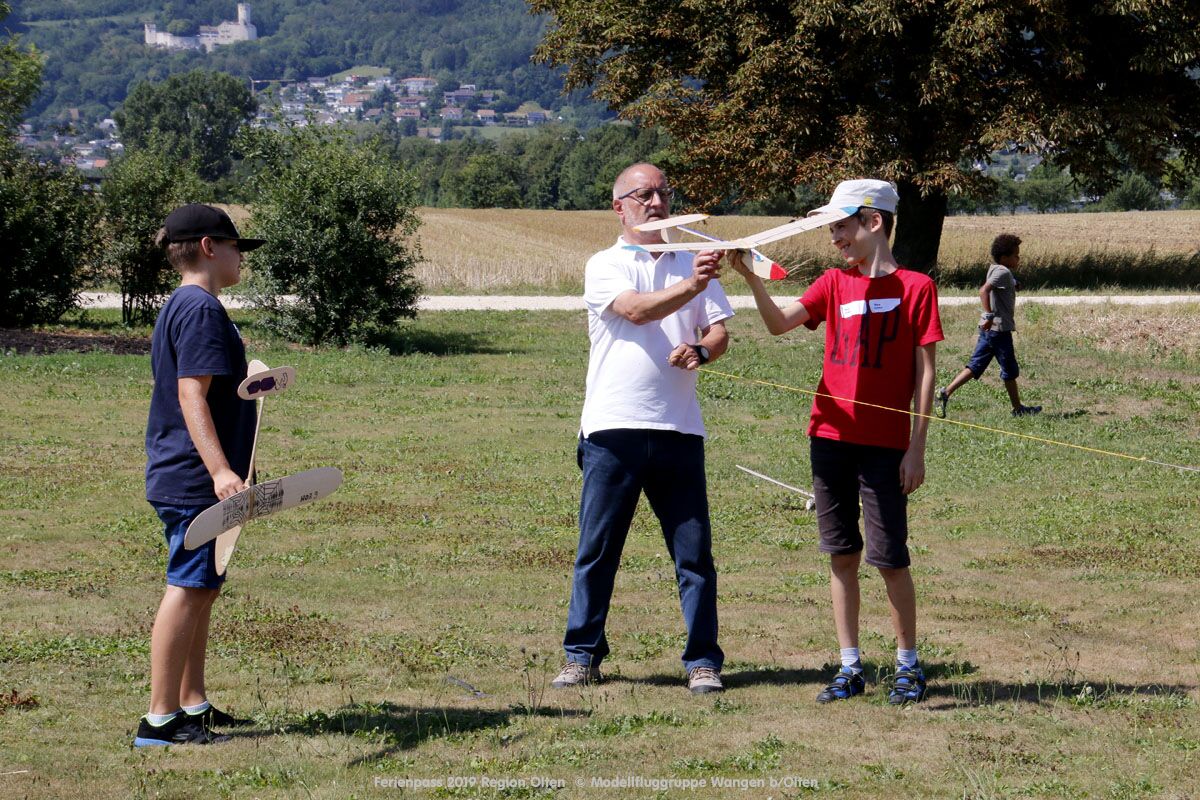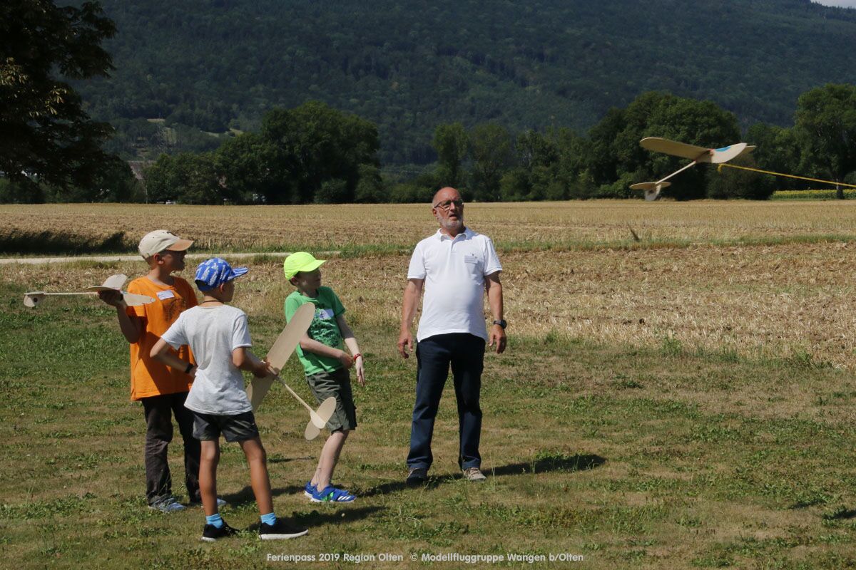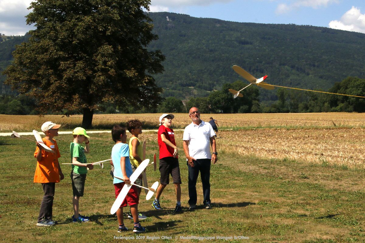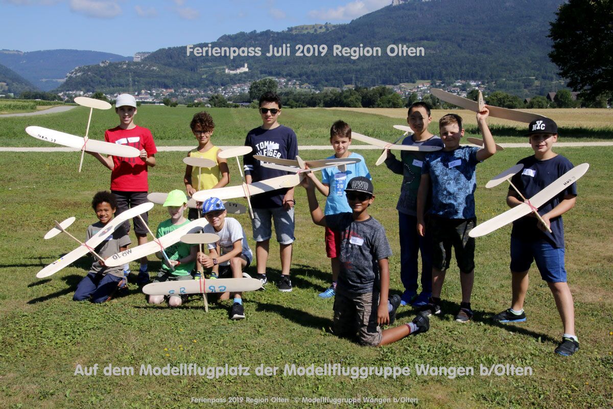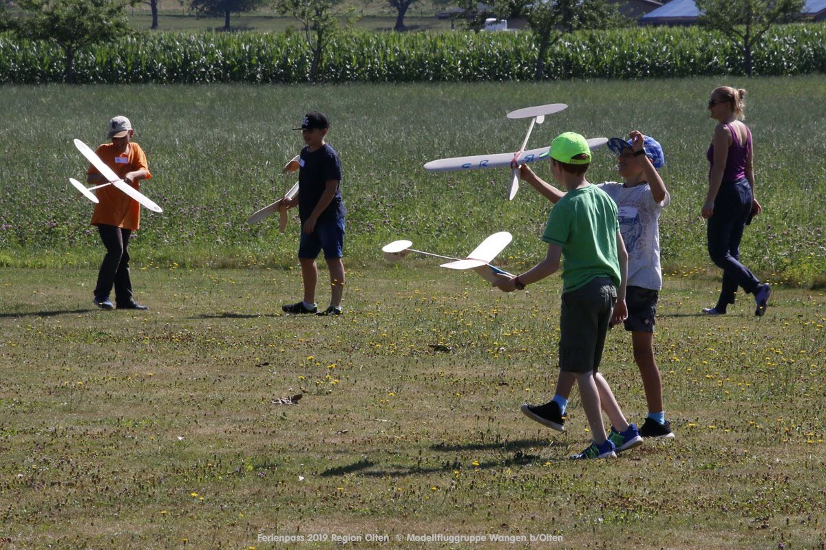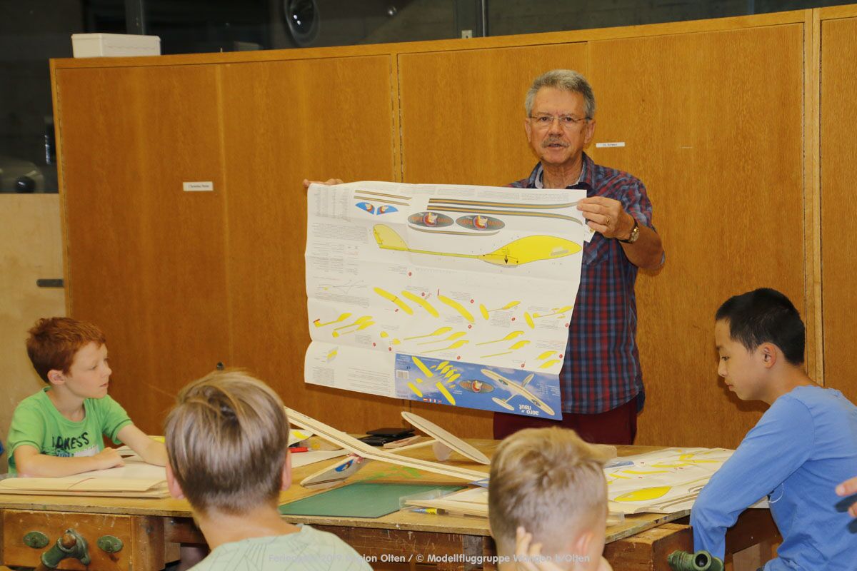 Anlässlich des Ferienpasses der Region Olten Ende Juli 2019, konnten wir 12 Schüler beim Kurs "Ein Flugzeug bauen und fliegen" im Hinterbüel Schulhaus in Wangen bei Olten begrüssen!