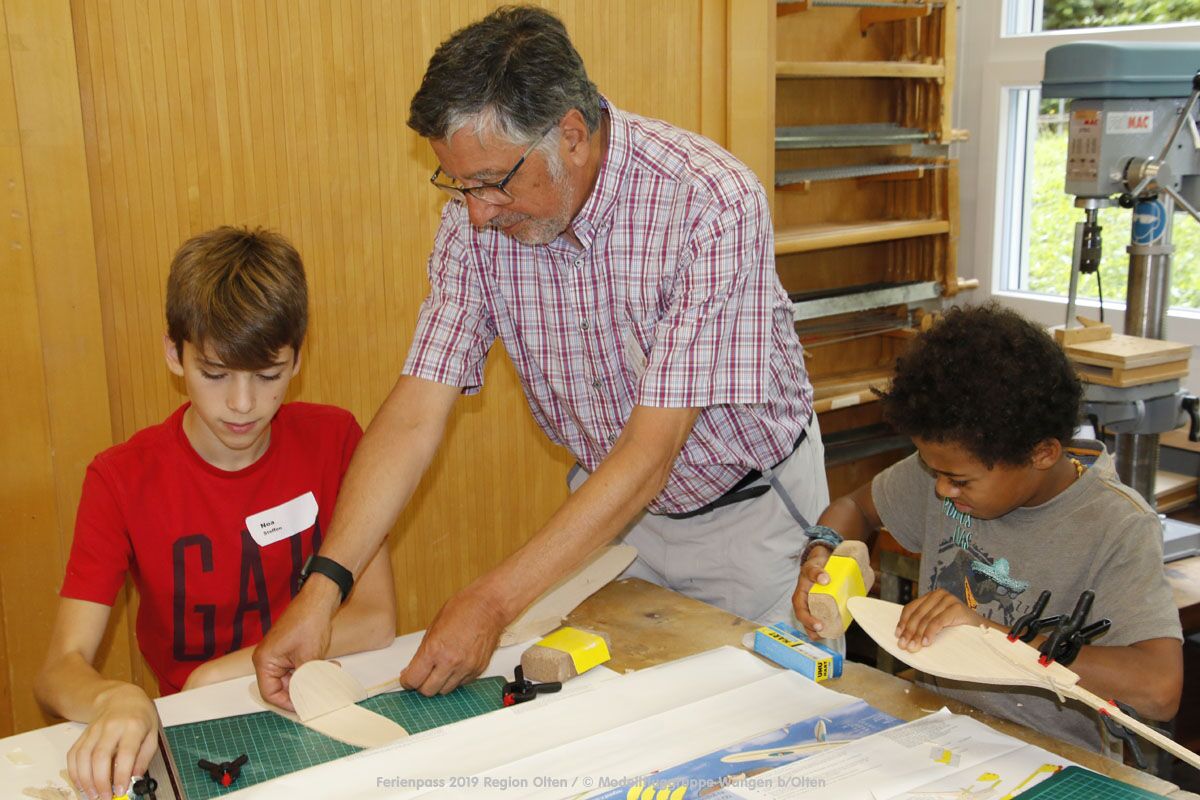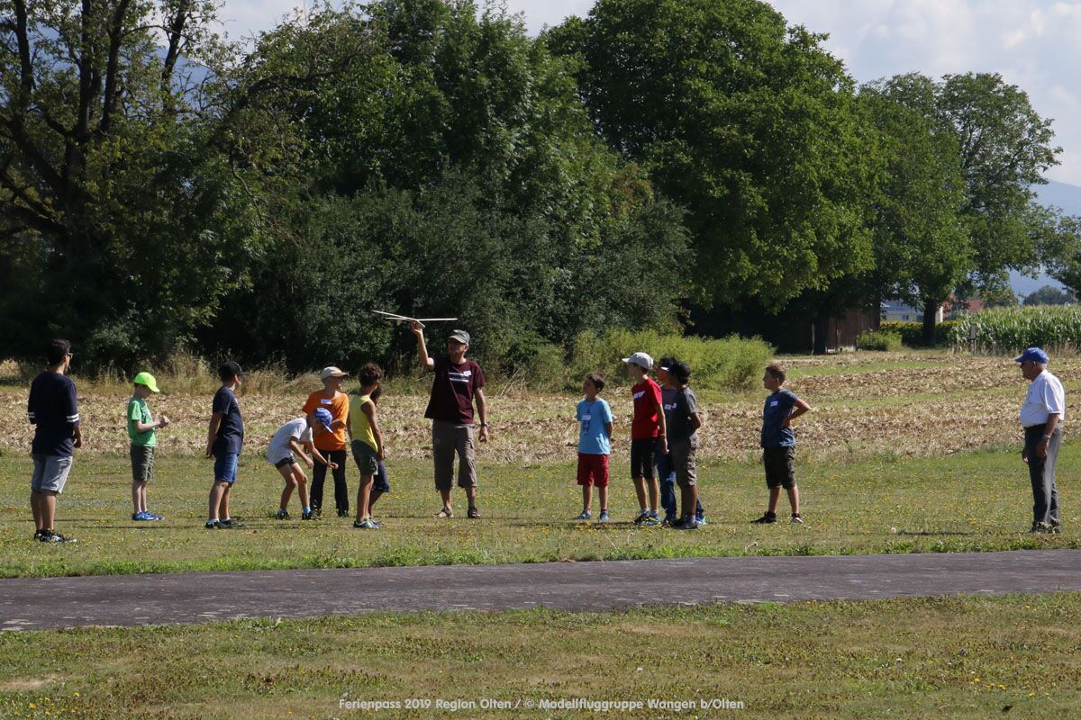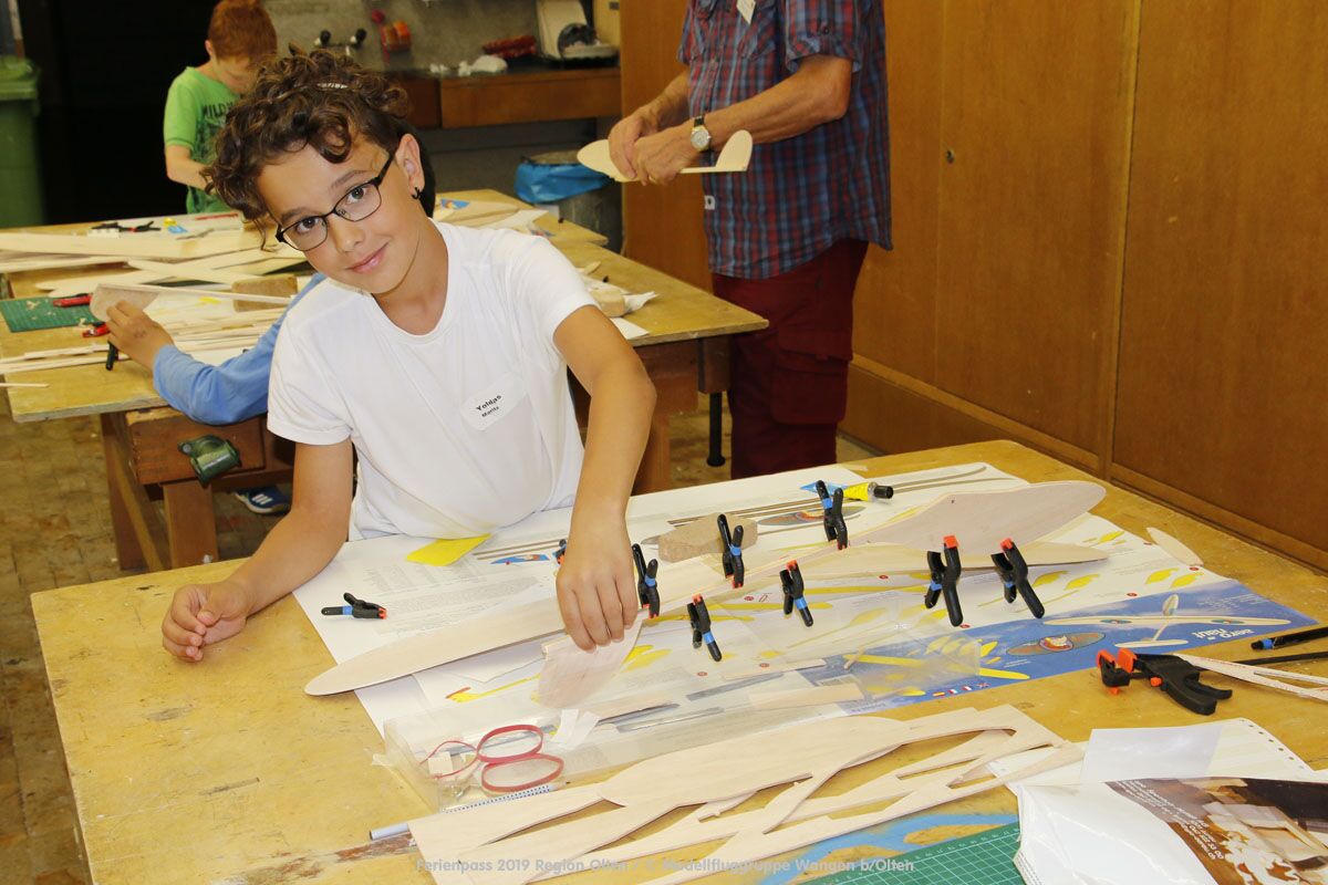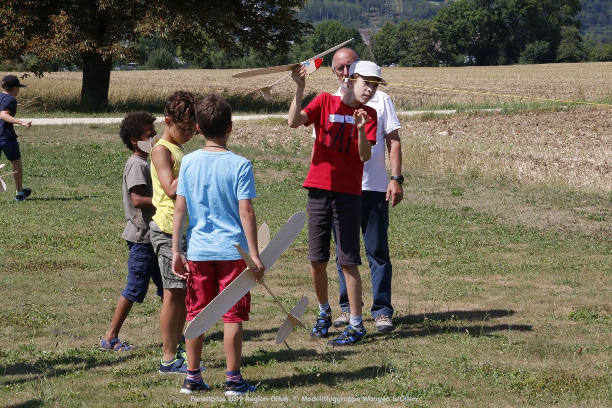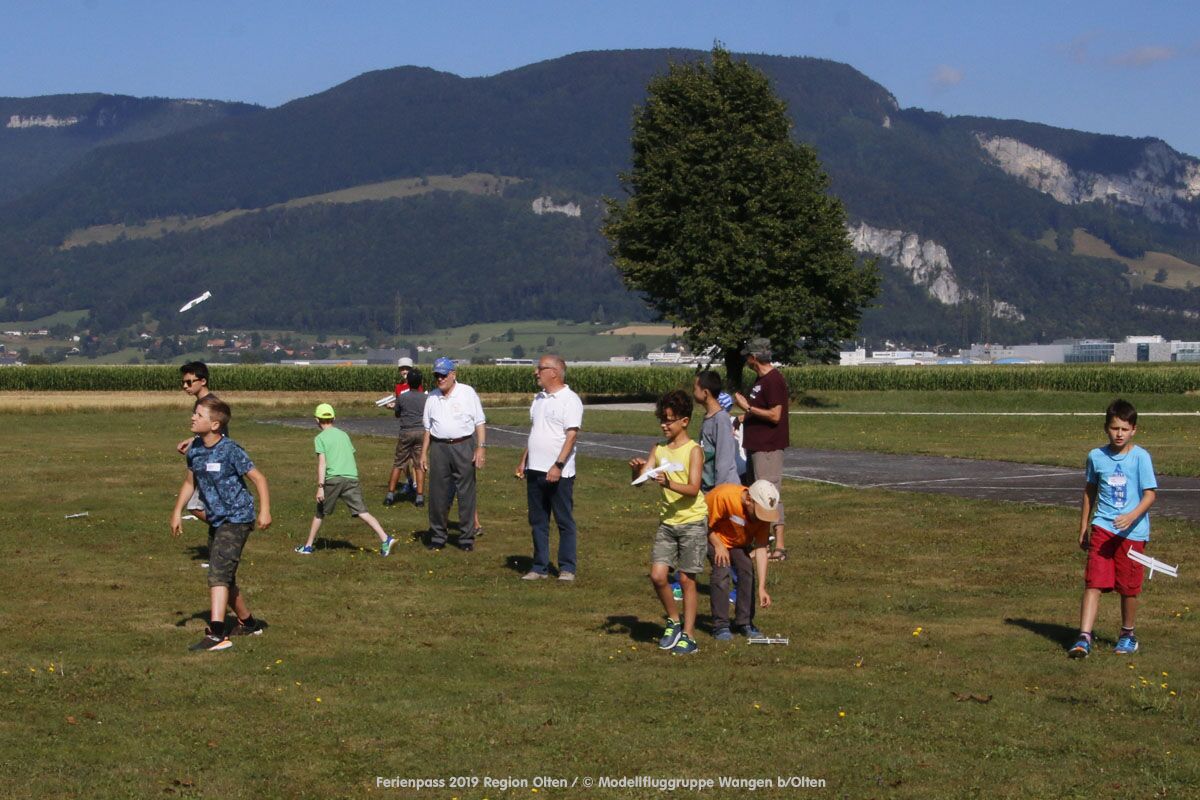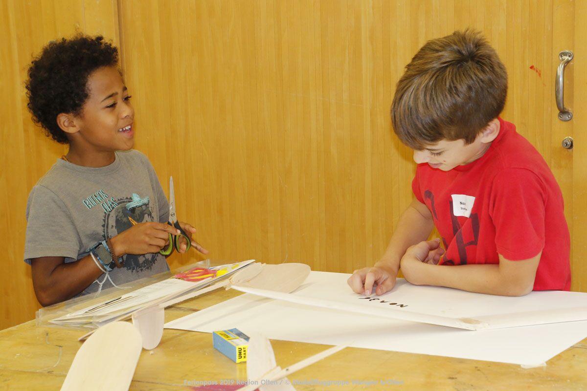Anlässlich des Ferienpasses der Region Olten Ende Juli 2019, konnten wir 12 Schüler beim Kurs "Ein Flugzeug bauen und fliegen" im Hinterbüel Schulhaus in Wangen bei Olten begrüssen!