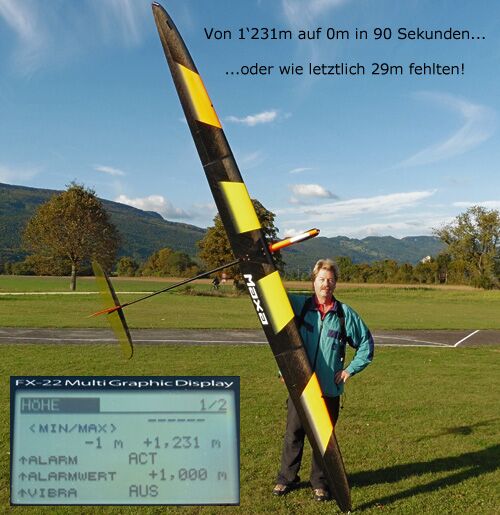 Bald mal hatte ich die 824m über Grund vom vorherigen Flug erreicht und es stieg aber stetig weiter und weiter..., bis der Höhenalarm an meinem FX22-Sender zu piepsen begann (habe diese Schwelle bei 1'000m / Grund eingestellt).