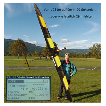 Und tatsächlich ging es weiter nach oben, langsam, aber doch immer noch ohne Unterbruch bis 1'200m. Es war aber nicht einfach, die "MAXA" unter der Wolke bei dieser Höhe im Auge zu behalten und dann wieder auf's FX22-Display zu schauen, welche Höhe abzulesen war. Von der "MAXA" mit ihren 4m Spannweite waren nur noch der Flügel als schwarzer Strich auszumachen, der Rest des Segelfliegers ist zu filigran, um noch etwas von blossem Auge zu sehen.