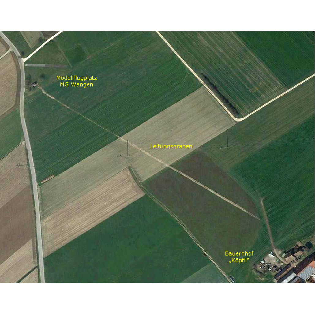 Der Leitungs-Graben der 560m langen Leitung vom Modellflugplatz zum Bauernhof "Köpfli" ist auch aus der Satelliensicht zu sehen!